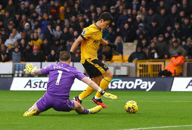 울버햄튼의 공세는 계속되었습니다. 전반 25분 코너킥 공격이 막히자, 쿠냐의 크로스가 도슨의 슈팅으로 이어졌습니다. 하지만 픽포드의 선방으로 기회를 다시 놓치는 듯했지만, 흘러나온 공을 킬먼이 밀어 넣으며 첫 골이 나왔습니다.