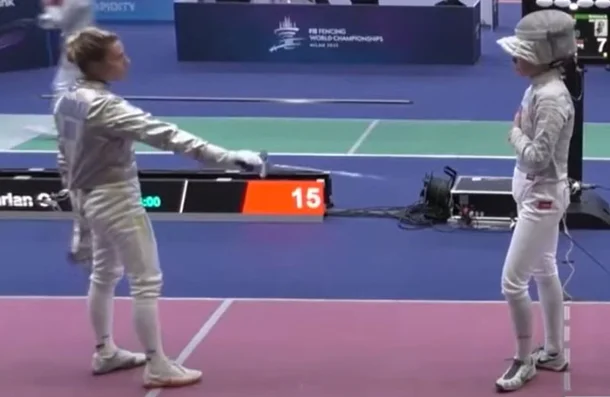 악수를 하려고 다가오는 스미르노바를 칼로 막아선 하를란은 악수 대신 검을 부딪치자는 뜻을 전했습니다. 하지만 스미르노바는 이를 거부하고 피스트에 의자를 놓고 1시간 가까이 항의를 이어갔습니다. 이게 무슨 황당한 일인가 할 수 있습니다.